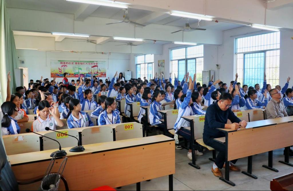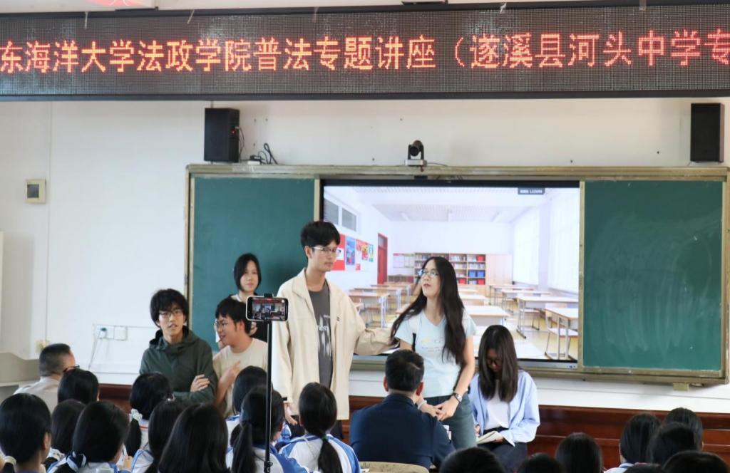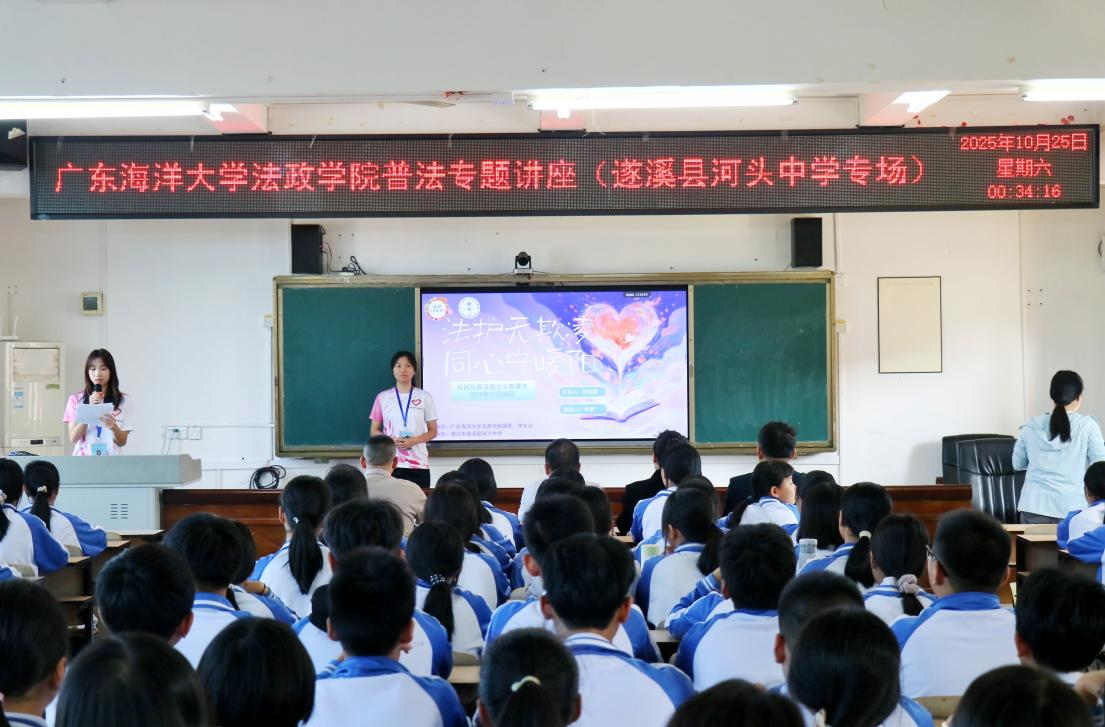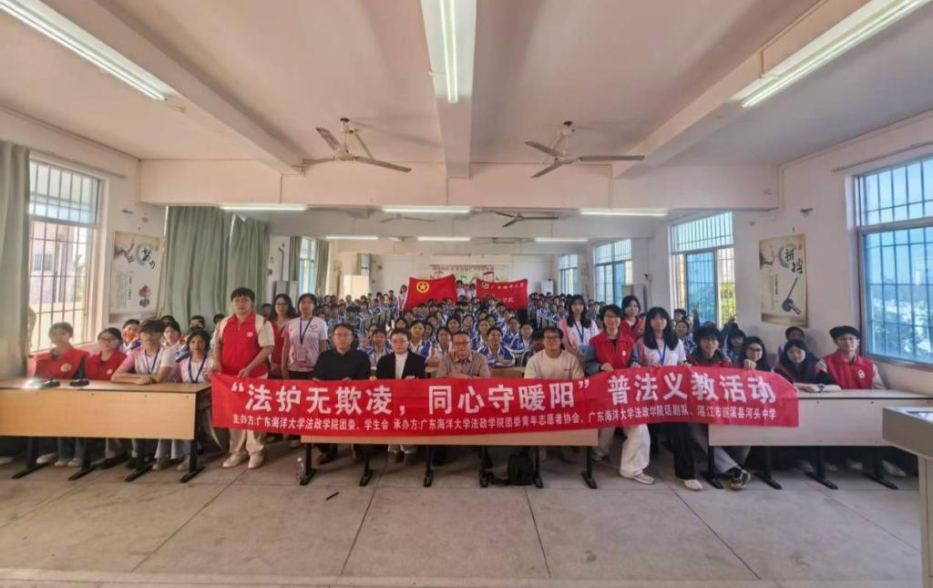 乡村振兴路,普法护航行。为助力遂溪县河头镇乡村振兴进程,发挥“一学院一乡村”党建帮扶重要作用,提升乡村中学生法治素养。2025年11月26日,学院团委、学生会联合青年志愿者协会、话剧队等单位,赴湛江市遂溪县河头中学开展“法护无欺凌,同心守暖阳”校园反欺凌普法义教活动。广东海洋大学驻河头镇帮镇扶村工作队队长兼镇委副书记梁卓其、法政学院辅导员兼院团委书记李禹辰、辅导员梁笑莹、驻河头镇帮镇扶村工作队副队长兼双村第一书记梁景元出席活动。