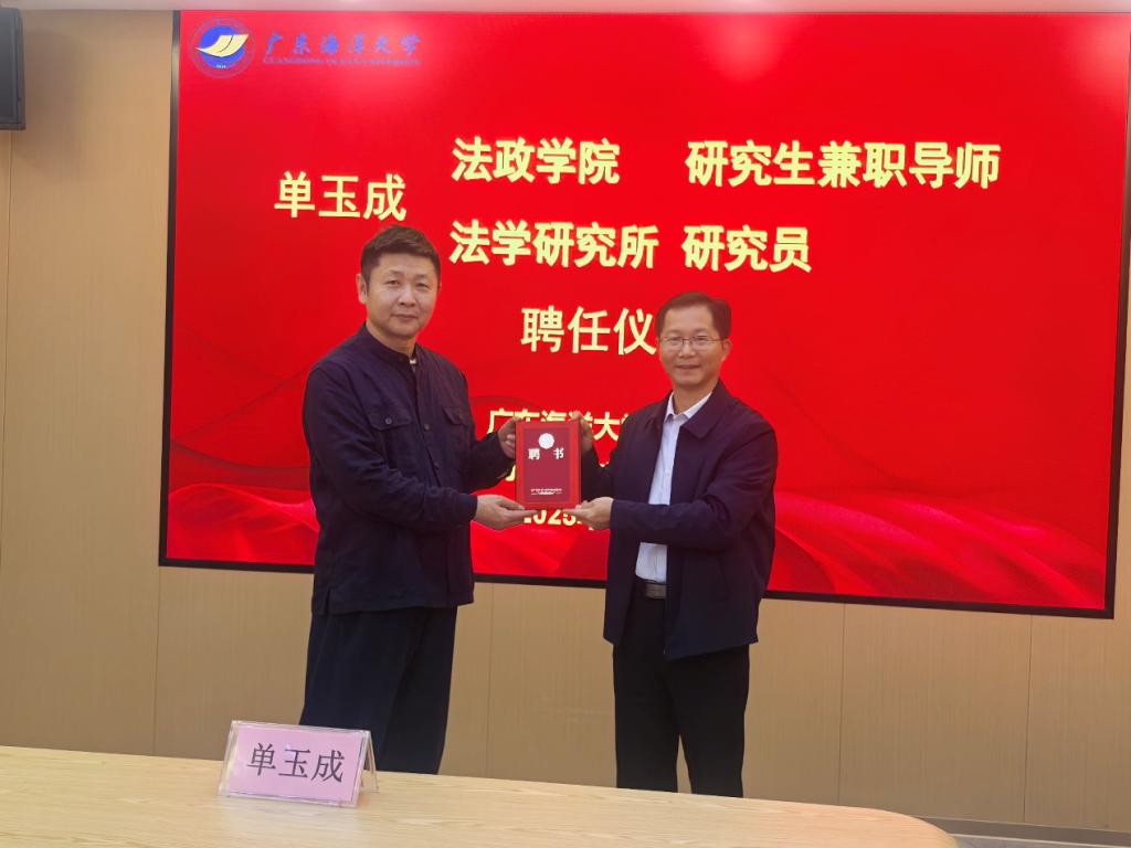 12月10日下午,广东海洋大学法政学院、法学研究所举行聘任仪式,聘请安徽润天律师事务所管委会主任律师、高级合伙人单玉成主任担任法政学院研究生兼职导师、法学研究所研究员。聘任仪式由法政学院副院长、法学研究所主任刘澍教授主持,由法政学院党委书记林忠新颁发聘书,充分体现了法学研究所在深化产学研融合、拓展高端法律实务导师队伍方面的积极努力。