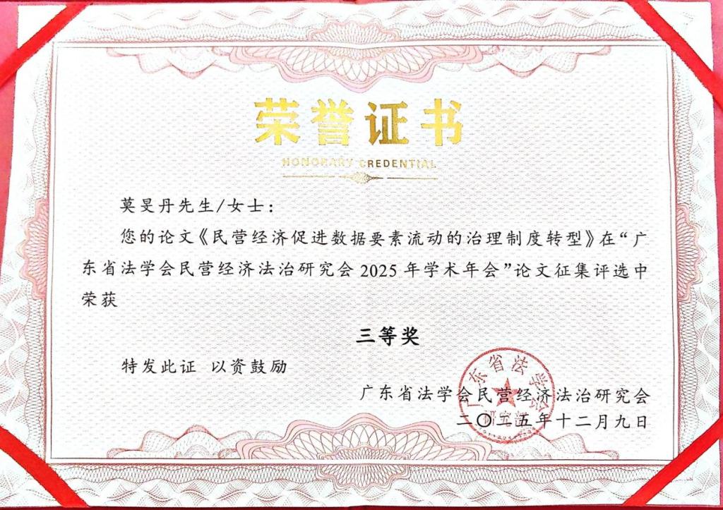 我院教师刘升副教授与莫旻丹博士作为广东省法学会民营经济法治研究会理事,应邀出席本次盛会。其中,莫旻丹博士在分论坛“民营经济发展的法治体系构建与制度创新”中作题为《民营经济促进数据要素流动的治理制度转型》的主题发言,莫旻丹博士立足于当前数字经济快速发展的时代背景,深入剖析了民营经济在数据要素在流动中的促进作用,系统阐释了现行治理在促进数据要素流动方面面临的实践困境,并提出了具有前瞻性和可操作性的制度转型建议。其发言逻辑严谨、观点鲜明,提交的同名论文在本次论文征集评选中荣获三等奖,获得了与会专家的积极评价。