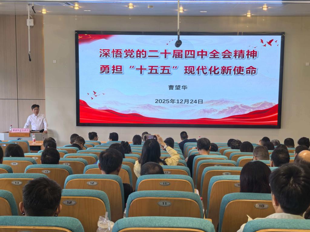 曹望华以“深悟党的二十届四中全会精神,勇担“十五五”现代化新使命”为题,从准确把握“十五五”时期在基本实现社会主义现代化进程中的重要地位、深刻领会“十五五”时期经济社会发展的指导方针和主要目标、全面理解“十五五”时期经济社会发展的战略任务和重大举措、坚持和加强党的全面领导,凝聚起推进中国式现代化的磅礴力量等四方面对党的二十届四中全会精神进行了系统阐释和深入解读。