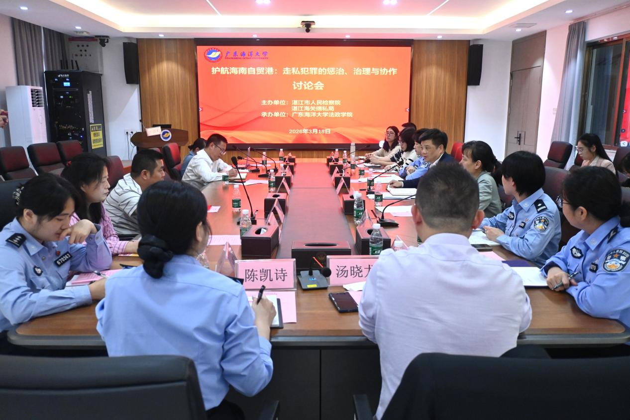 2026年3月19日,由湛江市人民检察院、湛江海关缉私局主办,我院承办的“护航海南自贸港:走私犯罪的惩治、治理与协作讨论会”涉海走私犯罪检察理论与实务讨论会在我校湖光校区顺利举行,会议由我院副院长刘澍主持。湛江市人民检察院刘真才副检察长、湛江海关缉私局于淇处长各带领本机关一线办案骨干代表参会,我院党委书记林忠新、刑事法学系主任张科、民商法学系主任刘升、海洋法与国际法学系副主任曲明姬、市委党校汤晓龙副教授等一同参会。